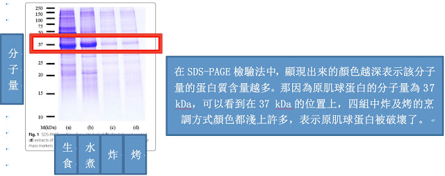 這時再藉由SDS-PAGE(一種檢驗蛋白質的技術)及質譜分析去檢測原肌球蛋白的含量。下圖為SDS-PAGE的檢驗結果: