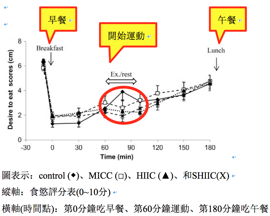 圖一B的第90分鐘發現,運動過程MICC(□)和HIIC(▲)組相較控制組血液饑餓素顯著降低;從圖一C觀察到運動後PYY有上升趨勢;