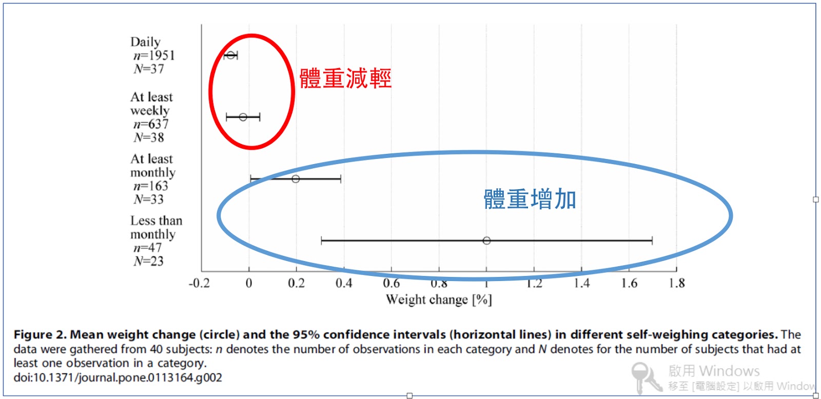 下圖的縱軸是受試者為期一年的量體重頻率,分為天天、每週至少一次、每個月至少一次、每個月少於一次,結果顯示,每天或每週量體重的人,一年下來平均體重有下降的趨勢(-0.1~0.05%);而每個月量一次或更少,整年下來的體重會增加至1.7%!