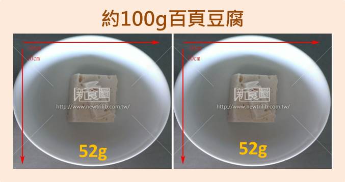 其實不然!下圖一塊百頁豆腐52克,兩張圖的份量加起來大約100克,這樣小小兩塊百頁豆腐就含約2份蛋白質、3.4份油脂。