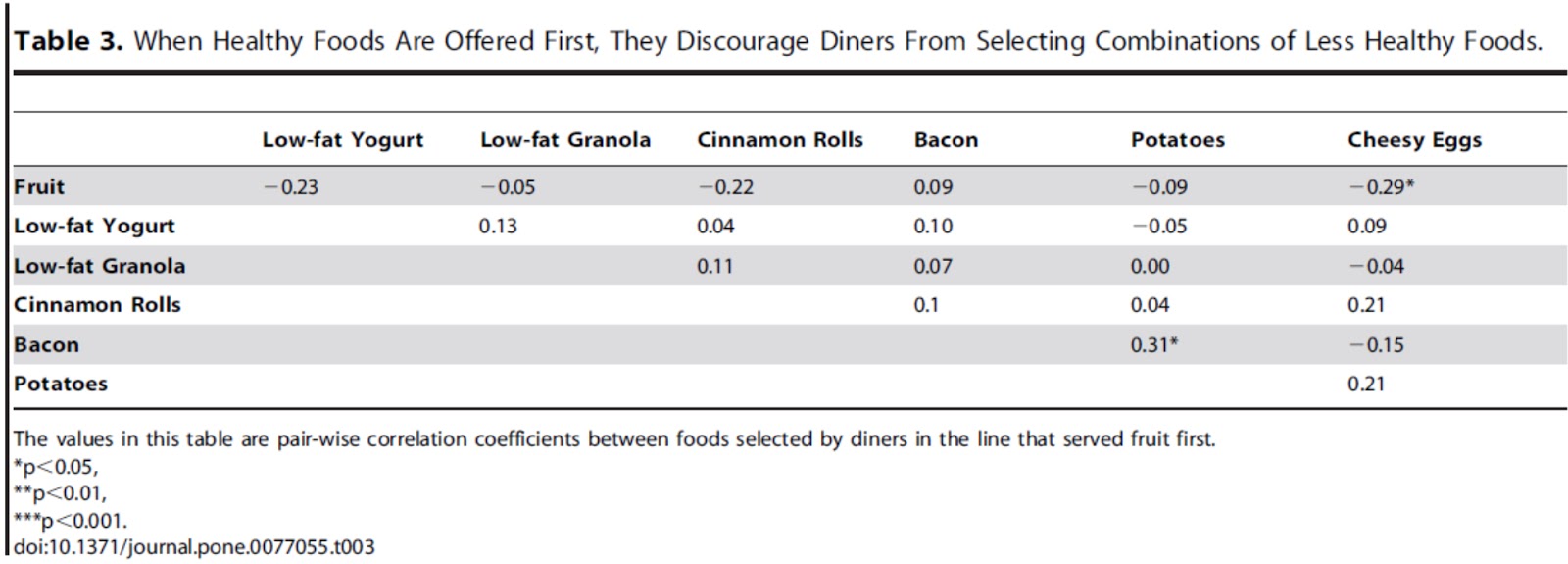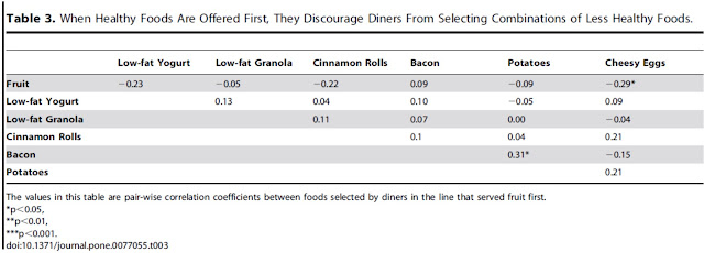 (2) 相對的,當先看到水果這條動線,在統計上唯一出現顯著正相關的食物是馬鈴薯與培根(相關係數=0.31),而水果與起司炒蛋則是顯著負相關(相關係數=-0.29) (table3)