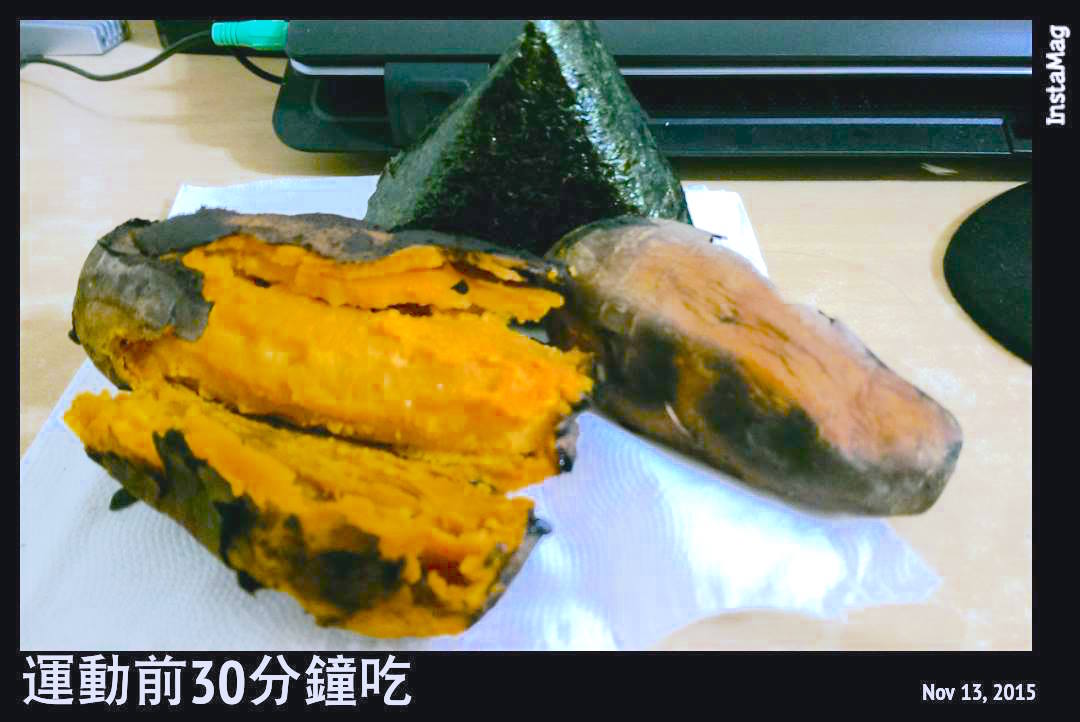 <路跑前30-60分鐘> 吃1個御飯糰加2個隔夜的冰小地瓜。