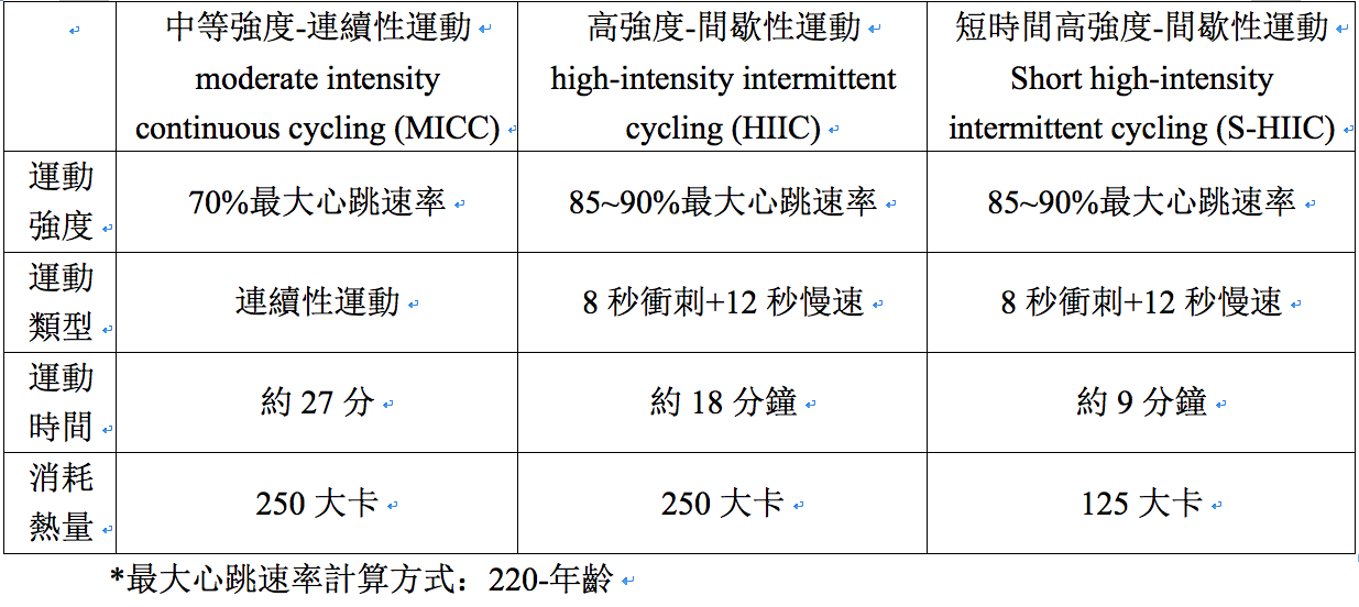 12位肥胖過重者,BMI平均32 kg/m2,本研究受試者空腹10小時,可喝水的情況下於上午8點吃早餐,並提供標準相同熱量600大卡早餐,三大營養素比例為17%蛋白質、35%脂肪、48%醣類,吃完早餐一小時後運動,控制組則不運動,午餐可自由選擇吃的食物量。