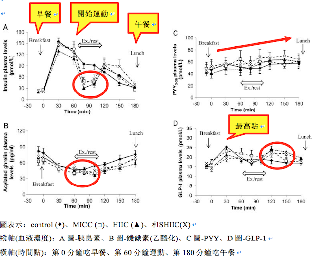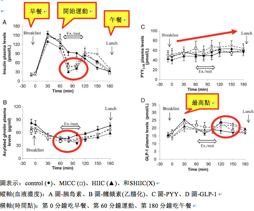 圖一B的第90分鐘發現,運動過程MICC(□)和HIIC(▲)組相較控制組血液饑餓素顯著降低;從圖一C觀察到運動後PYY有上升趨勢;