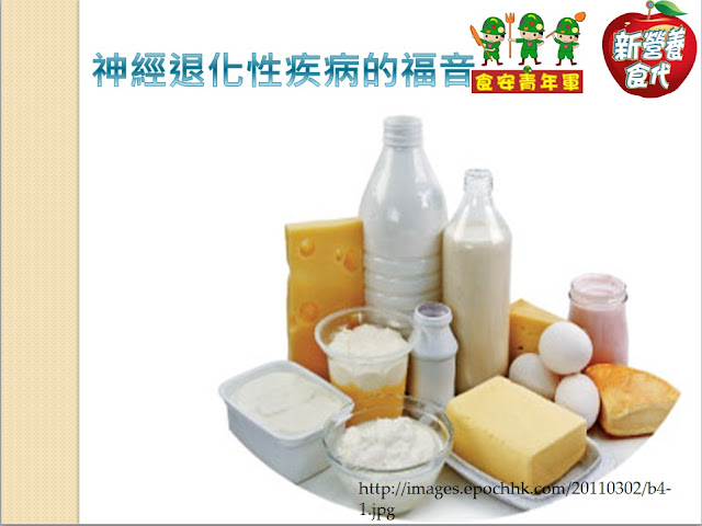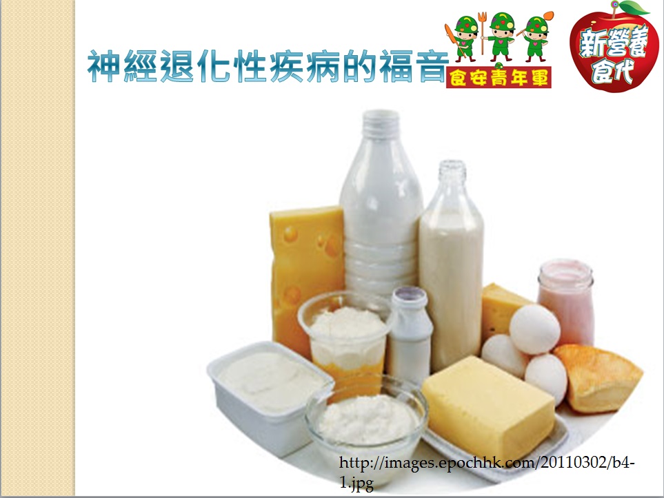 大腦中主要的抗氧化物質是穀胱甘肽(Glutathione),他可以犧牲自己去捕獲自由基進而降低自由基對身體細胞的傷害,可以說是犧牲小我,完成大我啊。所以要避免老年時的神經性退化疾病,適當的增加大腦中Glutathione的濃度是必須要的。然而,什麼樣的食物會增加大腦的Glutathione呢 ? 答案就是 乳製品及鮮乳