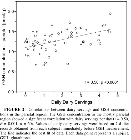 實驗結果發現乳製品的每日攝取份數和大腦中Glutathione濃度呈現正相關的關係,簡單來說就是當每天的乳製品攝取越多,大腦中的Glutathione濃度也就越高,如此一來便可以提高大腦的抗氧化能力並藉此降低神經退化性疾病的發生機率。
