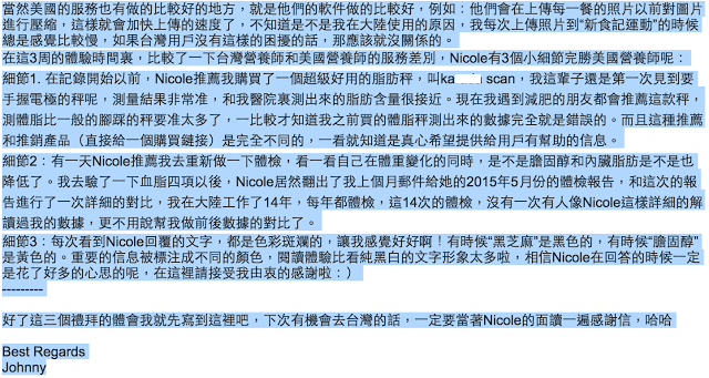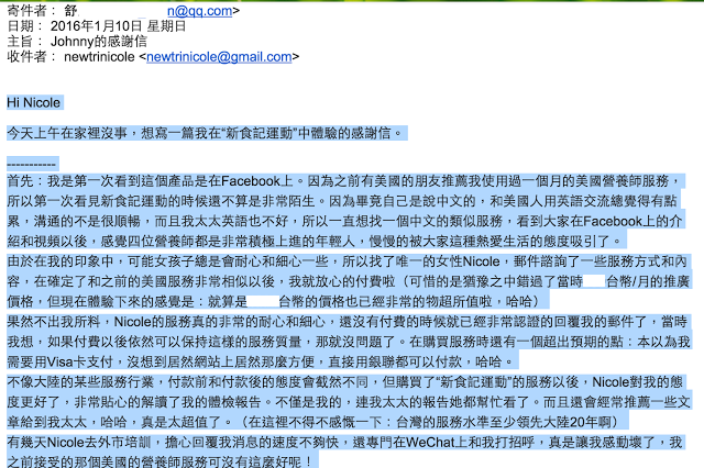 不像大陸的某些服務行業,付款前和付款後的態度會截然不同,但購買了“新食記運動”的服務以後,Nicole對我的態度更好了,非常貼心的解讀了我的體檢報告。不僅是我的,連我太太的報告她都幫忙看了。而且還會經常推薦一些文章給到我太太,哈哈,真是太超值了。(在這裡不得不感慨一下:台灣的服務水準至少領先大陸20年啊)