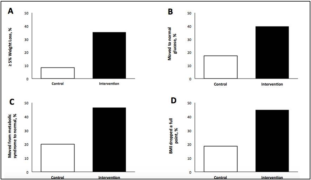 (原文說明:Proportion achieving secondary endpoint thresholds at 6 months. Error bars not shown because all differences between control and intervention were P<.001. A: Percentage with ≥5% weight loss (complete data: n=156 control, n=136 intervention). B: Percentage who moved to normal fasting glucose (from ≥100 mg/dL to <100 mg/dL) (denominator: n=150 control, n=126 intervention). C: Percentage who moved from having metabolic syndrome to not having metabolic syndrome (denominator: n=110 control, n=86 intervention). D: Percentage whose BMI decreased by 1 kg/m2 (denominator: n=156 control, n=136 intervention).)