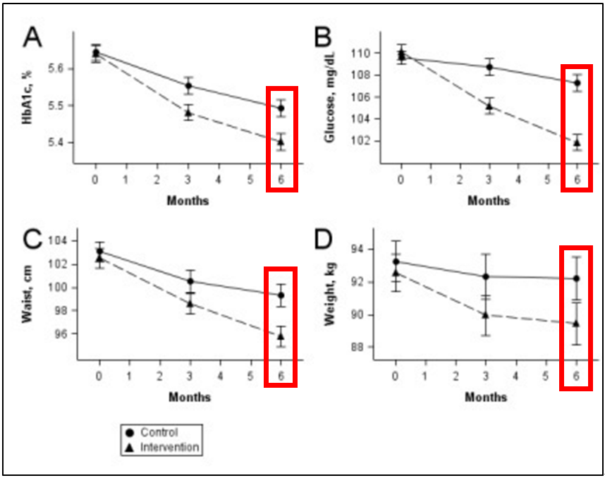 (原文說明:Changes in primary and secondary endpoints over time. Solid line: control; dashed line: intervention; error bars: ± standard error. A: Change in HbA1c. B: Change in fasting glucose. C: Change in waist circumference. D: Change in weight. At 6 months, all measures were significantly different between control and intervention groups (P<.001).)