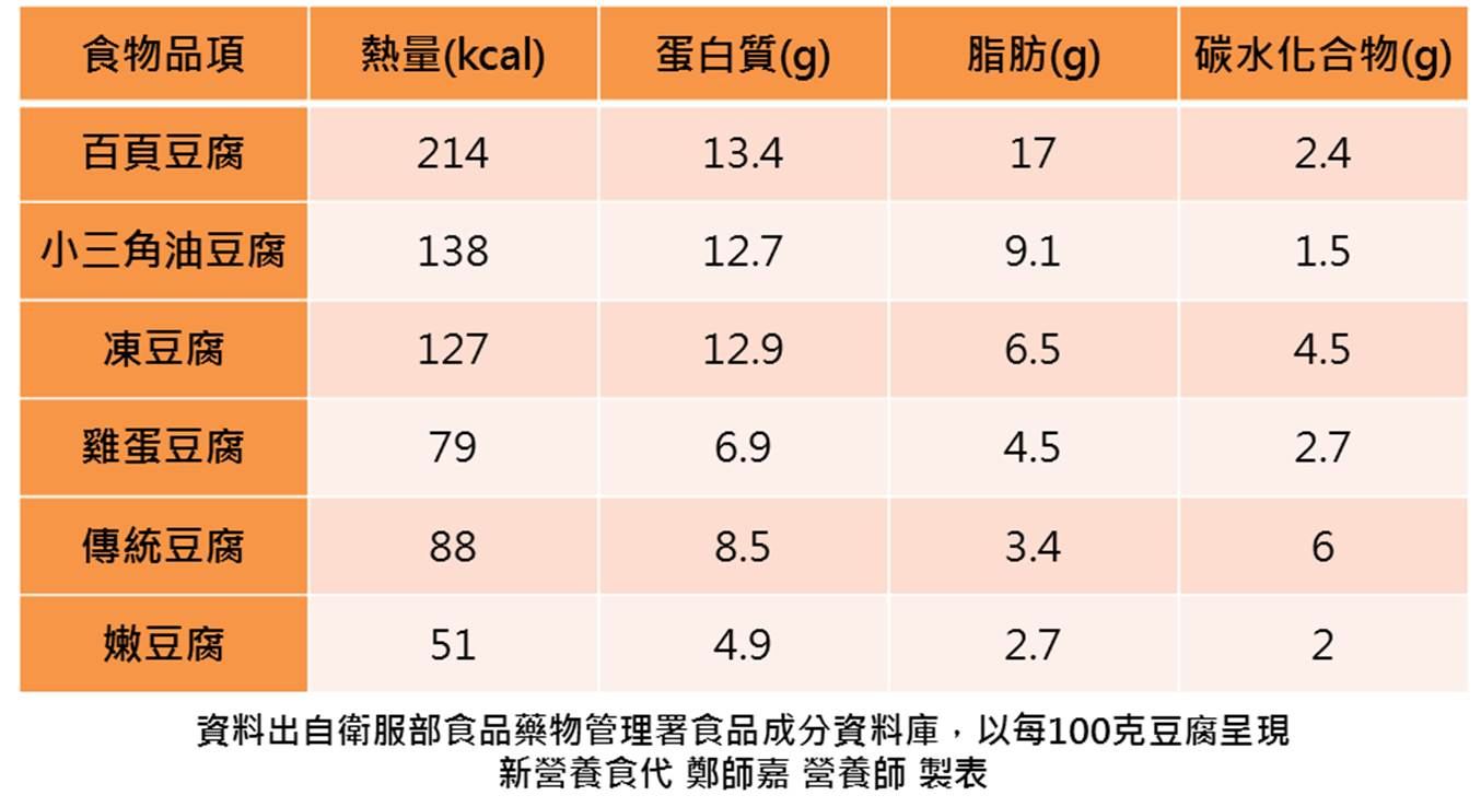 營養師從衛福部食品藥物管理署之食品營養成分資料庫中,挑出民眾最常吃的6種豆腐品項。