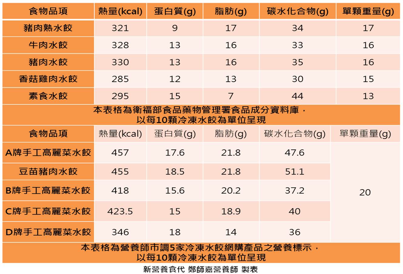 因此除了統整衛福部所提供的資料,營養師也市調五家知名網購冷凍水餃,以10顆冷凍水餃為單位,進行熱量與三大營養素的比較。
