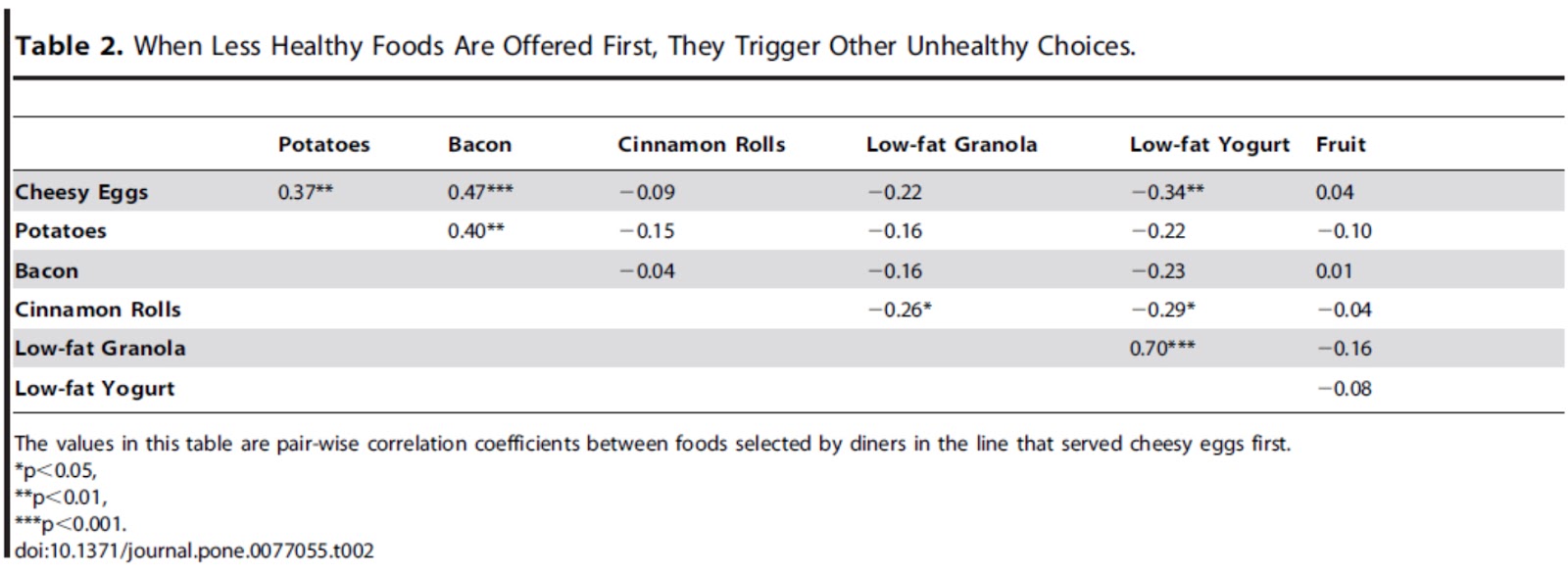 (2) 相對的,當先看到水果這條動線,在統計上唯一出現顯著正相關的食物是馬鈴薯與培根(相關係數=0.31),而水果與起司炒蛋則是顯著負相關(相關係數=-0.29) (table3)