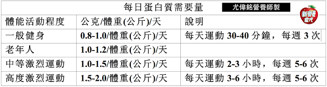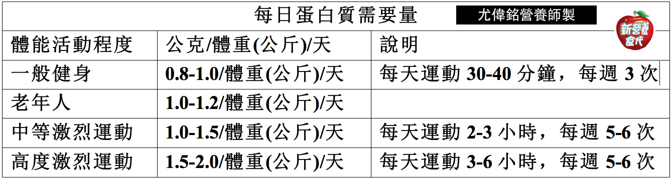 尤偉銘營養師建議有運動及健身習慣的民眾,每日飲食蛋白質的攝取量約每公斤體重0.8~1.0公克